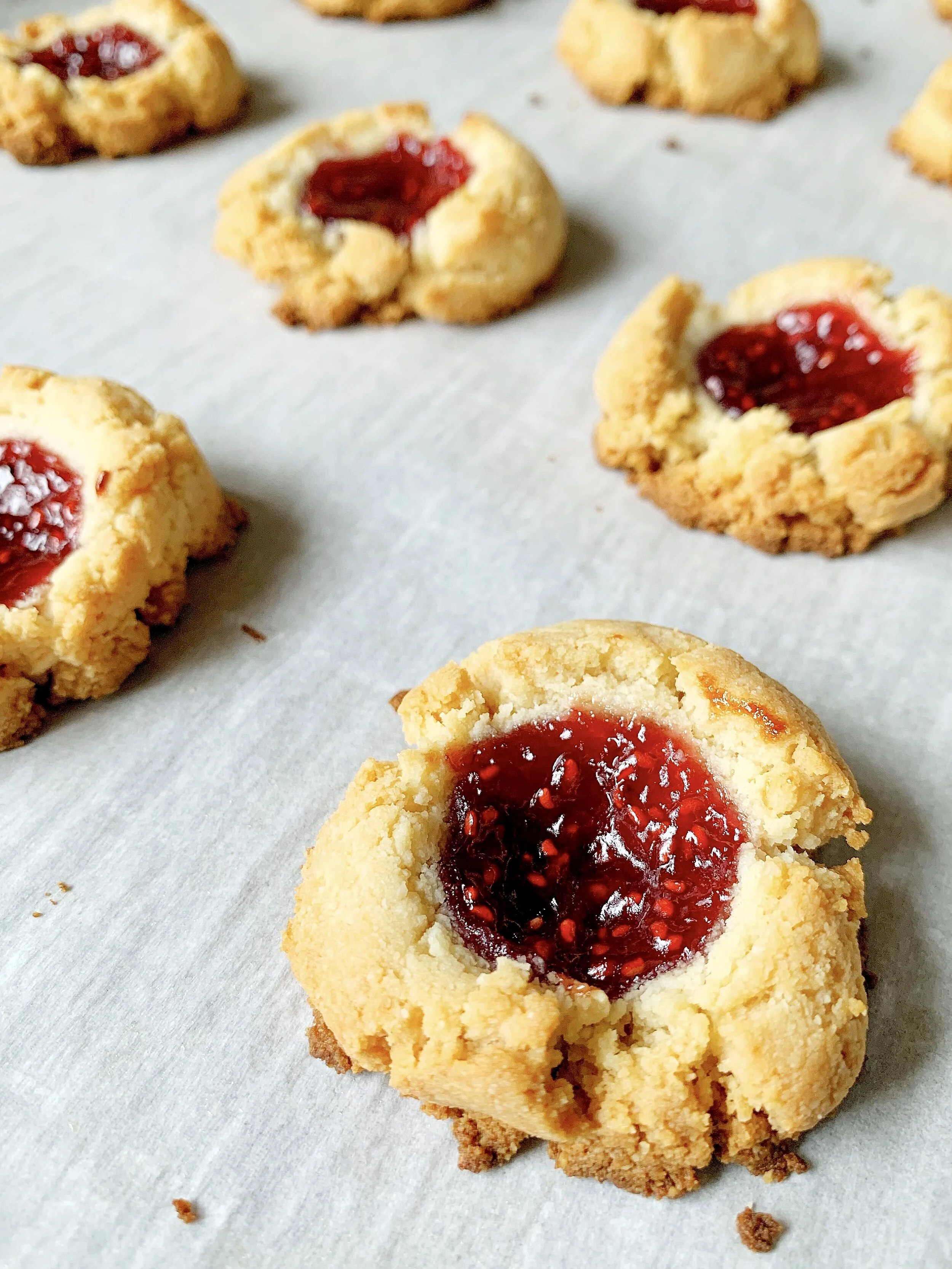 These quick and easy raspberry thumbprint cookies are the perfect cookies to make for any occasion. They’re soft, lightly sweet, and absolutely delicious! They also happen to be grain-free and gluten-free. I used raspberry jam, but feel free to experiment and use whatever jam you’d like!